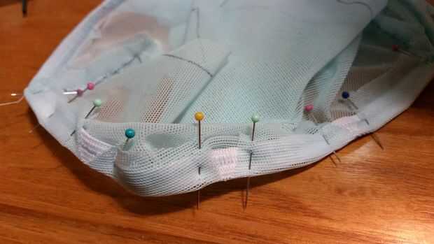 Entonces vas a ser insertar el elástico de la cinta en el escote. Para hacer esto, usted comenzará poniendo el elástico a lo largo de la abertura para el revés de la tela, fijar en su lugar a medida que avanza. Esto probablemente requerirá un montón de alfileres y mucha paciencia. Seguir adelante y coser el elástico en su lugar y retire los pernos.