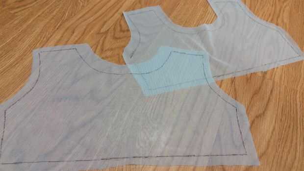 El trabajo de preparación para la parte superior es exactamente igual que las otras piezas, por lo que parte debe estar familiarizada en este punto, aunque las piezas del patrón será diferentes: la parte superior delantera, la espalda superior y dos mangas. Doblar por la mitad partiendo de la mayor cantidad de estiramiento, prender sus piezas del patrón a lo largo del doblez, trazar, cortar con margen de costura de 1/2 pulgada, prender las piezas del conjunto a lo largo de la línea de costura con los lados derecho de tocar. Los cuatro de las piezas de la parte superior se pueden cortar a lo largo de un pliegue, que hace este proceso mucho más fácil.