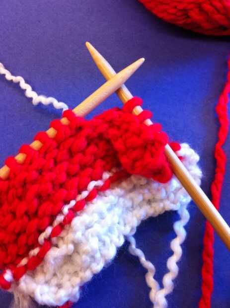 Tejer 6 hileras con hilo rojo, luego comienzan a disminuir un punto al final de cada fila para 2 filas