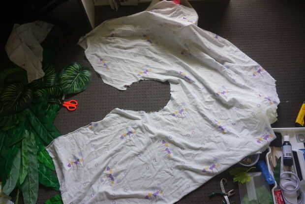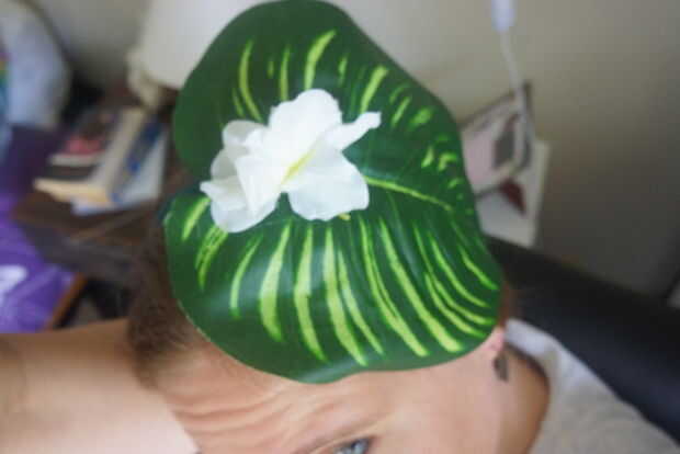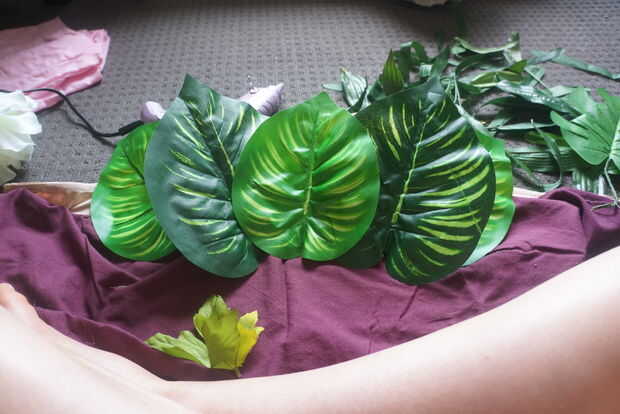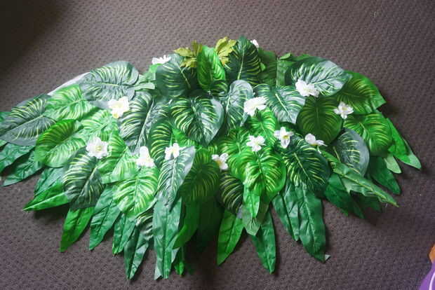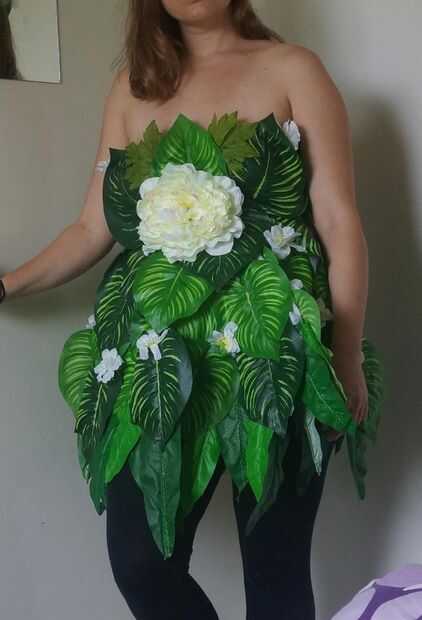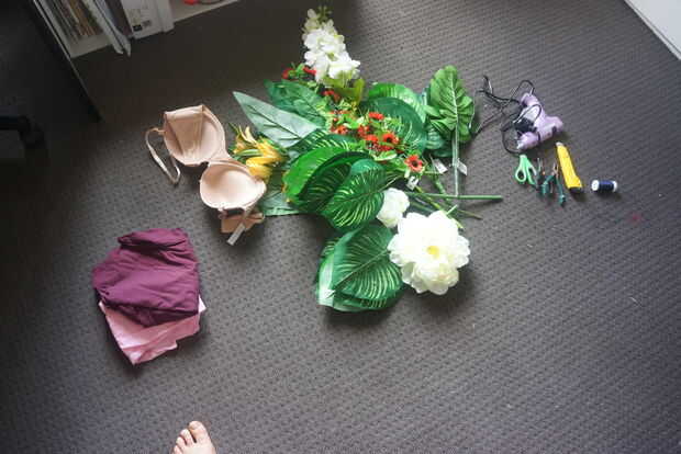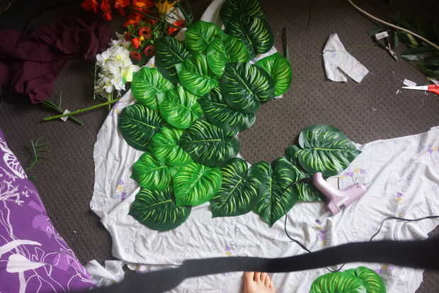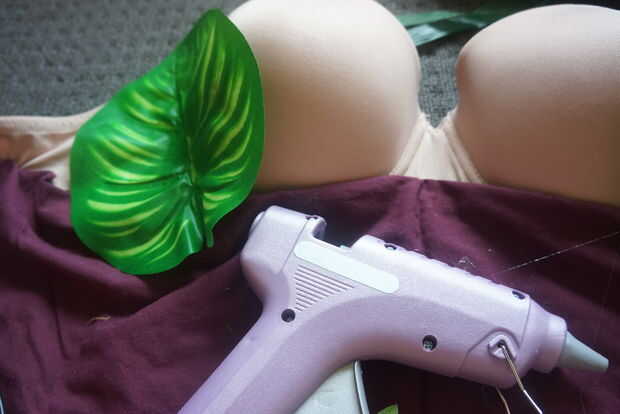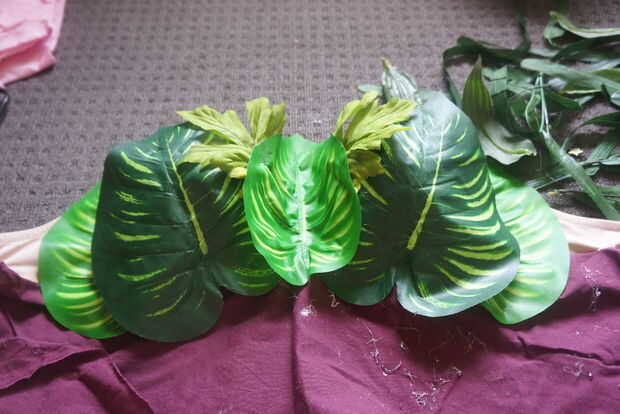 Usted puede encontrar que las hojas de la parte elástica del sujetador no son tan seguras. Hacer puntadas pequeñas para asegurarlos. También utilice pequeños puntos de sutura o pegamento para fijar las hojas/flores que deje visible las piezas de la tela de la falda. Añadir cualquier otra decoración que desea. Agregué una flor grande al frente de mi vestido y había hecho un pedazo de cabello con una banda verde de alice, pegamento caliente y cierta izquierda sobre materiales.