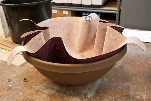 La forma y el tamaño de la taza va a determinar cómo se pliega la tela. Un recipiente más grande y superficial funciona muy bien. Un balde de 5 galones le dará un pedazo más vertical. Experimento con esto.