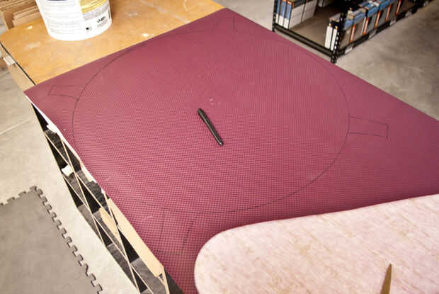 Dibujar un gran círculo unos 2' de diámetro en la tela. Deja unas pestañas alrededor del perímetro. Estos se utilizarán como manijas.