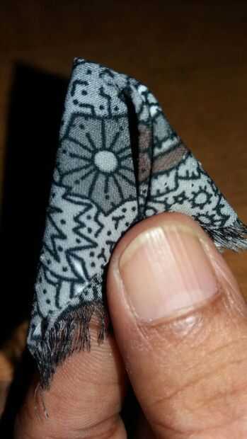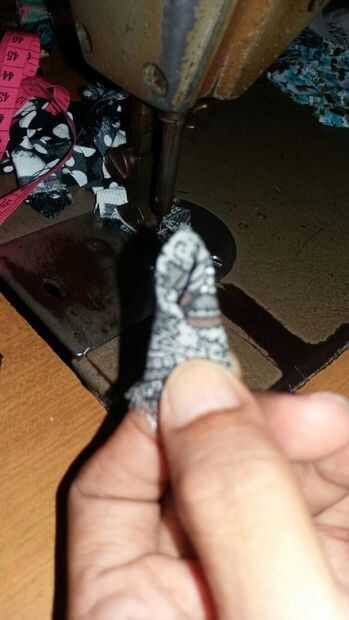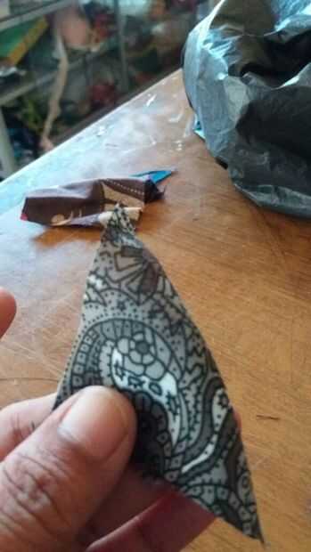a continuación, tomamos la materia prima de reciclaje. Corte el lado izquierdo y derecho alrededor de 6cm. Luego doblar el reciclaje de materia prima en forma de triángulo. Doblar dos veces como veis en la imagen. Siguiente parte coser.