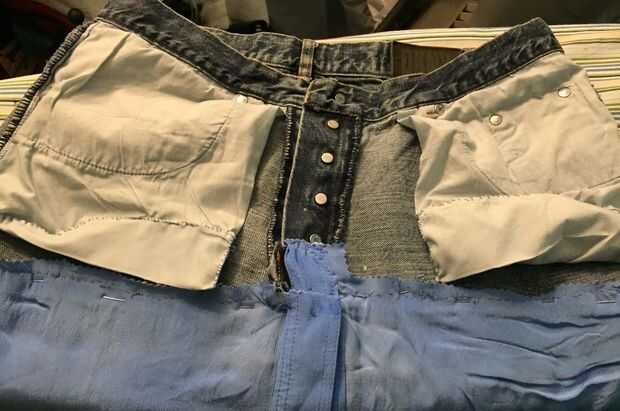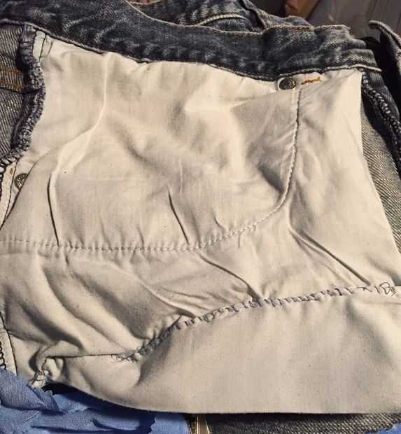 Este paso es bastante sencillo. Tuve que acortar los bolsillos, porque pude ver las "manchas blancas" cuando probé el vestido después de la fijación lo. Entonces, cosí la parte inferior del vestido a los pantalones vaqueros. He cortado el exceso tejido sobrante con las tijeras dentar y cosido sólo sobre ese borde para evitar el colapso.