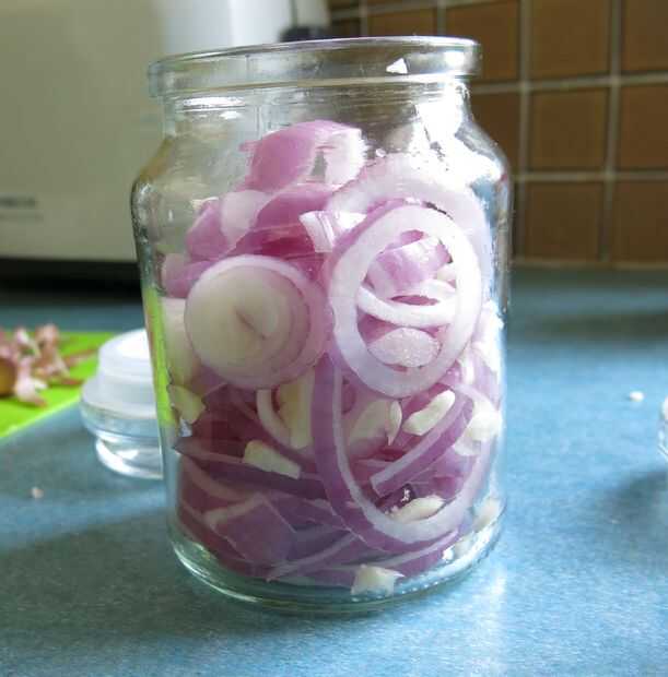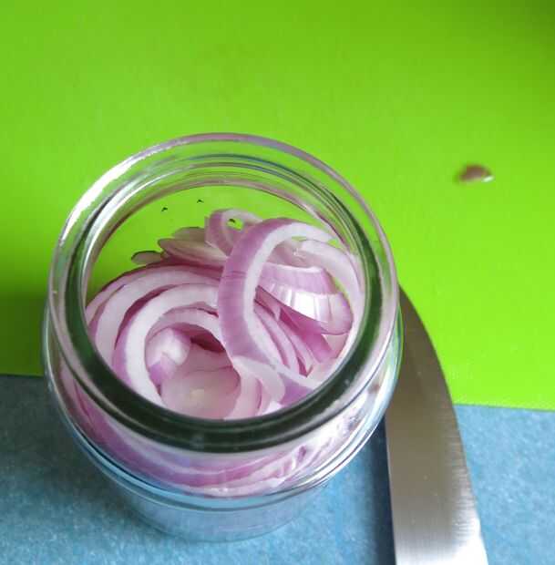 En primer lugar, cortar la cebolla en rodajas y poner todos los trozos en la jarra.