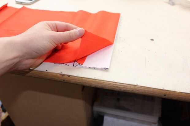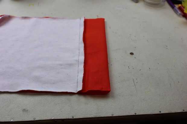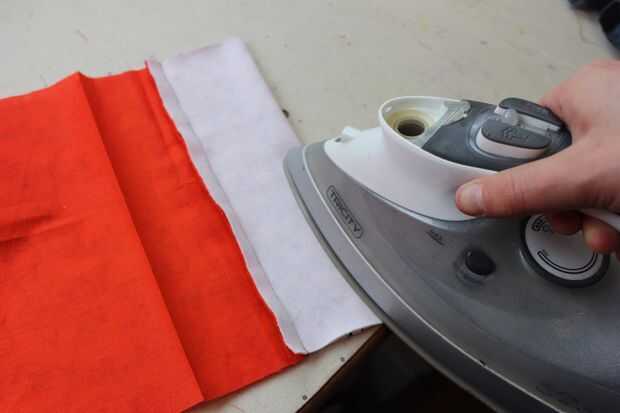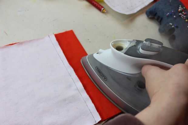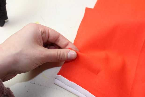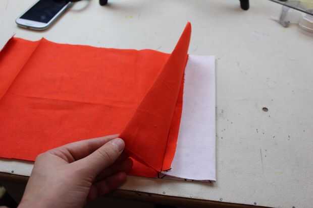 Una vez hecho esto, partido que los bordes doblados juntos a cada lado, la costura en los bordes cortos serán empujados hacia el interior. Entonces el pin todo en su lugar.