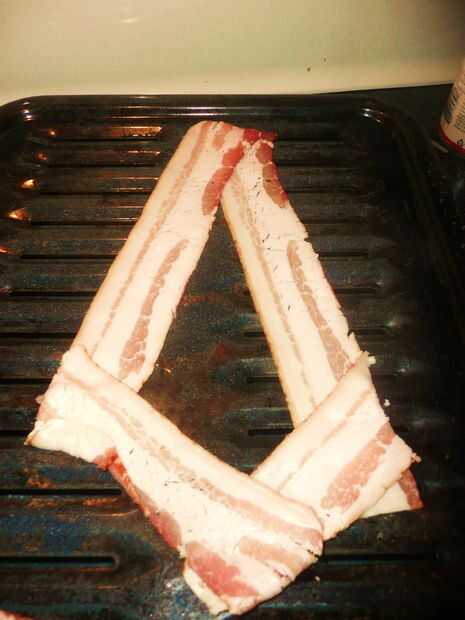 Tomar 3 de las tiras de tocino. 2 lugar de las tiras en forma de V con los extremos superpuestos. Cortar la otra tira por la mitad y coloque las dos mitades juntas, conectar las dos piezas completas para crear una forma de lazo básico (marque el cuadro para la colocación). Hice mía un poco más amplia, pero que puedes hacer tuyo como amplio o estrecho como quieras.