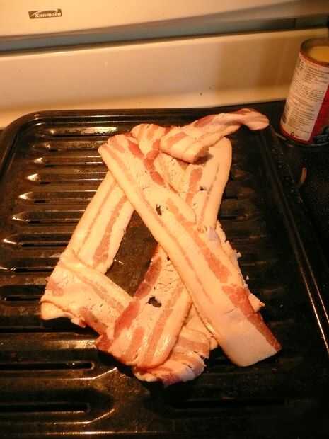 Ahora ponen 2 tiras más en la parte superior del marco, como se muestra en la imagen. En este punto, el medio realmente no debería tener cualquier lagunas importantes en él. Empezar a tejer el tocino juntos. Elevar una tira como en la imagen, coloque otra en el otro dos, y baje el primero sobre la nueva tira. Levante la segunda franja y colocar una segunda nueva tira en todo como lo hizo con la primera. Meter un extremo de la tira de nuevo en el marco y baje la tira levantada. Mira las fotos para ver cómo lo hice, en el caso de mis descripciones son demasiado confusas seguir.