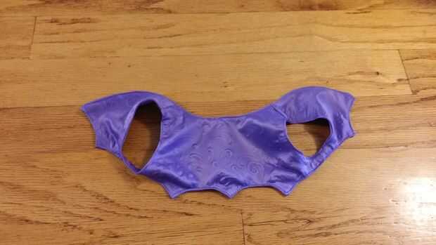 Coloque el patrón del chaleco delantero en satén púrpura plegado y corte todo el camino alrededor, hacer 2 piezas.