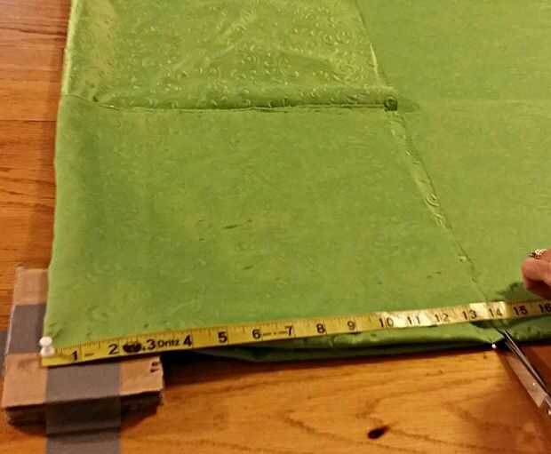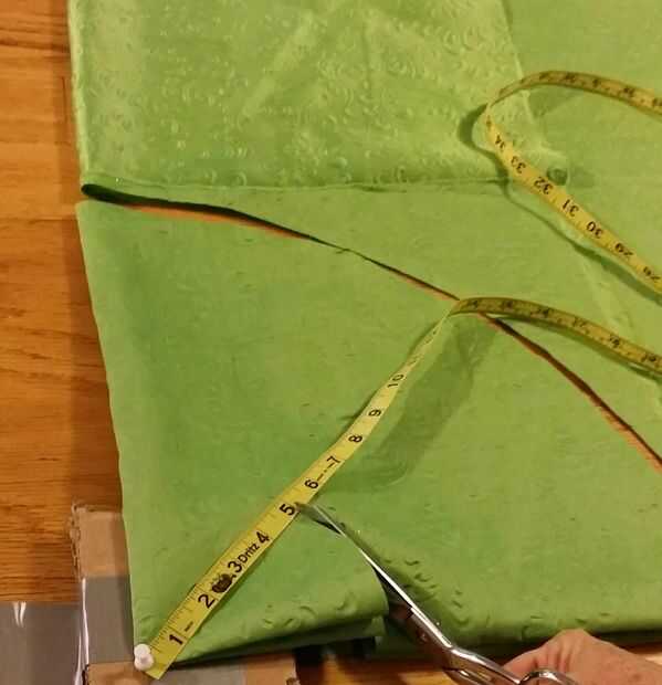 Mida 14" de la esquina (doblado) centro y corte a lo largo de la línea curva. Siempre corte el círculo exterior primero. Luego Mida y corte 5"(radio de 10" círculo de diámetro) curvada línea.