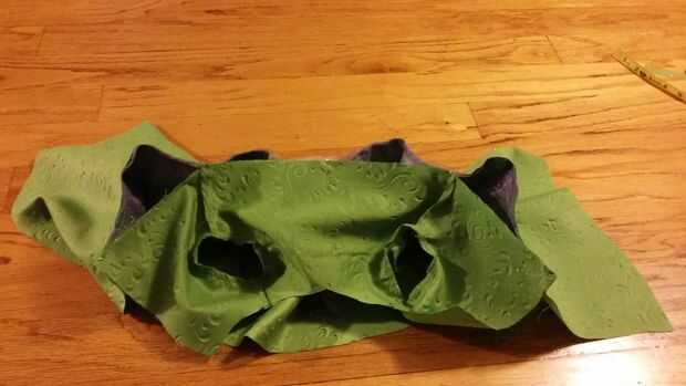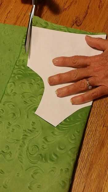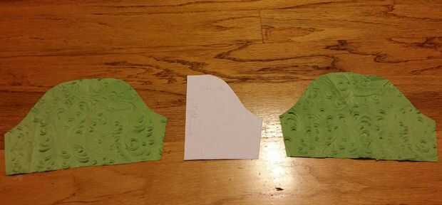 Patrón de la manga lugar en doblado verde satinado con línea central de la manga a lo largo de foldline de la tela. Tire el patrón 1 1/2" de doblez para hacer manga soplada.