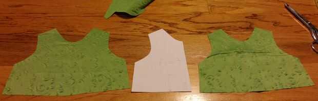 Coloque el patrón de blusa espalda sobre doblado verde satén añadiendo margen de costura de 1/2" para la cremallera a lo largo de la parte posterior de centro y corte. Esto hará que 2 piezas. Repita este paso para hacer 4 piezas.