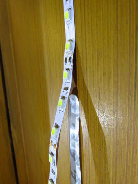 Las tiras de LED eran bastante fáciles de aplicar. Comencé por la parte superior y aplica la tira por pelar el forro protector mientras que progresaba hacia abajo. Aplicar la tira de abajo arriba sería más difícil. Si el forro protector primero se elimina totalmente, la tira sería más difícil de manejar.