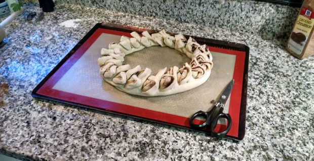A partir de cualquier punto del anillo, use sus tijeras de cocina para cortar ranuras en la masa, dividir en porciones de pequeños segmentos. Mientras estás haciendo, doblar los segmentos alternativamente izquierda y derecha como se muestra en el video.