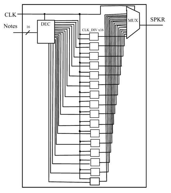 Cada generador de onda de sonido contiene un divisor de reloj que se construye con una frecuencia específica, estática para su respectiva nota. Todos los generadores de salida una señal baja o una onda cuadrada que se alimentan en un bus de 16 bits amplia.