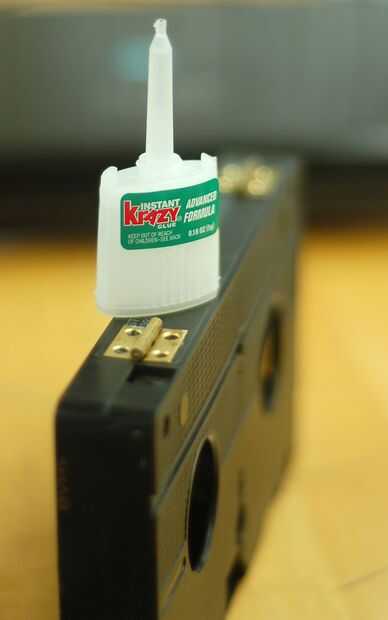 En la parte inferior del cassette VHS conectar dos bisagras. Usé el pegamento loco para fijar las bisagras (hasta ahora se ha mantenido sin romper aparte).