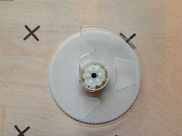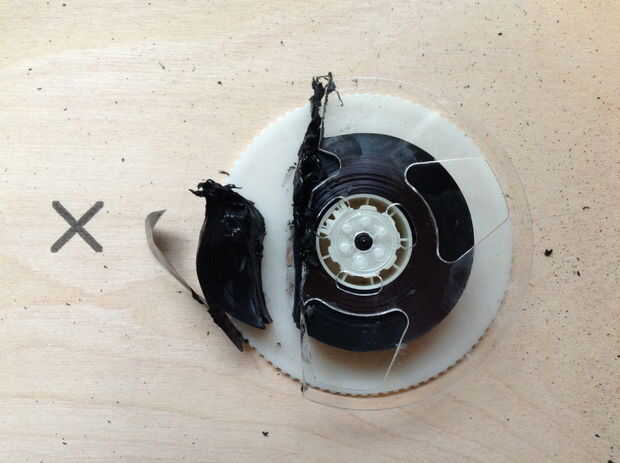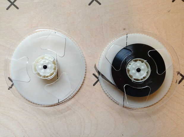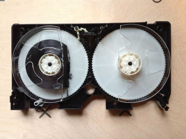 -Colocar los carretes en el caso VHS. Girarlas para que las piezas sin cortar de las bobinas son visibles a través de las ventanas. Asegúrese de que el VHS todavía puede ser cerrada, y que los cortes no son visibles a través de las ventanas.