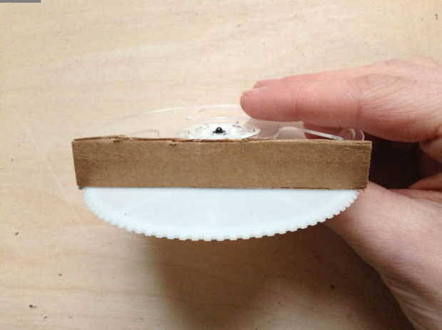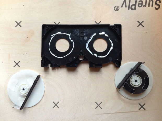 -Encolar las dos bobinas para el caso VHS la mitad inferior. Posición para que sólo las piezas sin cortar de las bobinas son visibles a través de las ventanas en la mitad superior de la caja.