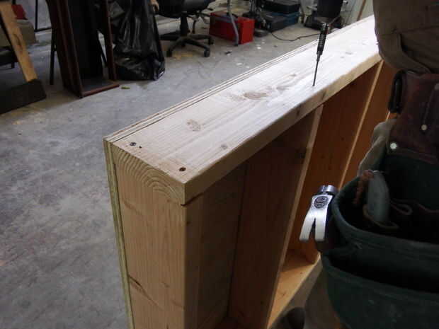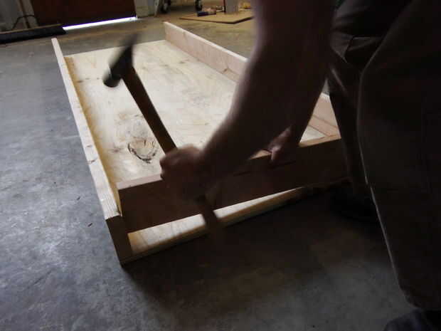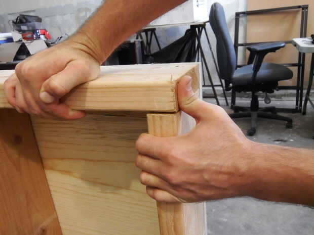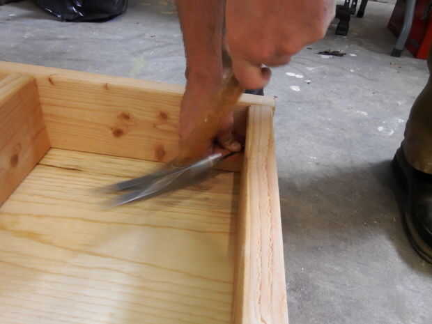 Si la madera está ligeramente combada en las esquinas, pueden martillo un clavo desde el interior para hacerlo a color, entonces atornille los tornillos de la parte.