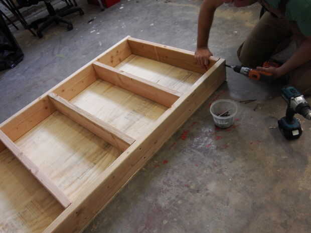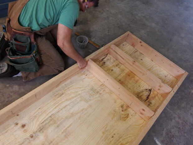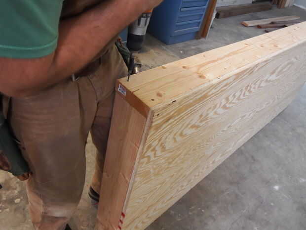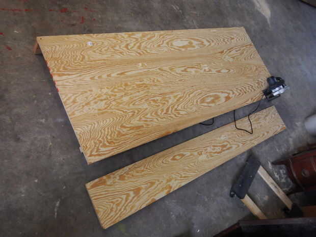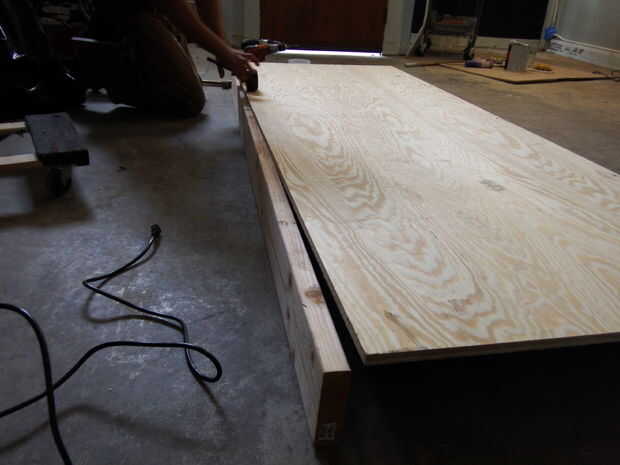 En primer lugar, cortar 1 pie lateral la madera para que sea un espacio de trabajo dentro de los brazos. Luego, conecte los 2 "X 6" X 8' juntas por el borde largo de la madera contrachapada y asegúrelo con 3.5" tornillos para madera.