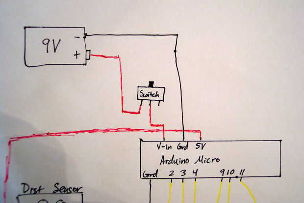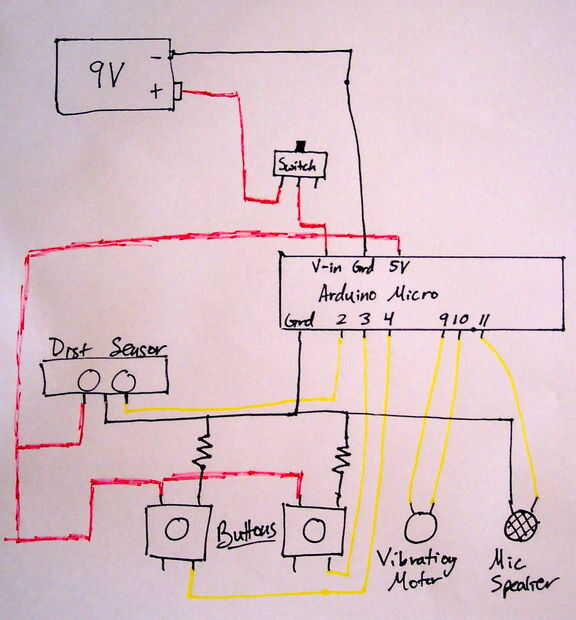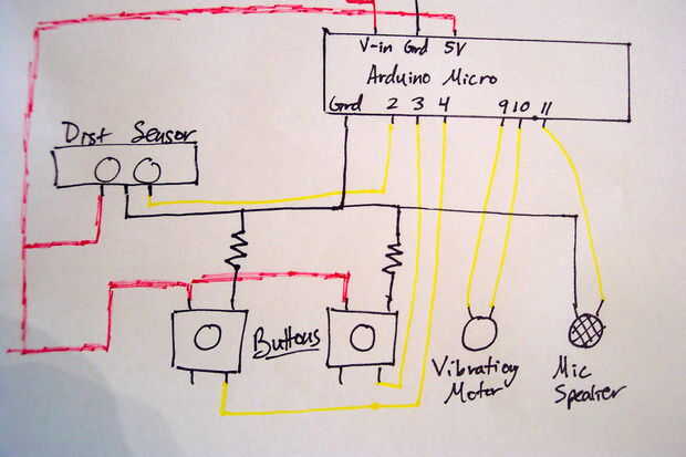 Ahora es el momento para hacer una maqueta del circuito. Pan mina abordó al principio para asegurarse de que todos trabajaron y probar el programa y así que realmente recomiendo hacer algo similar antes de que suelde todo. Se puede ver el circuito básico para mis componentes a continuación. No dude en utilizar partes tienes y modificarlo en consecuencia. Observe que los motores de vibración deben ser conectados a pines PWM para controlar correctamente. Una vez que tienes configurado para arriba, usted está listo para descargar el programa y probarlo de verdad!