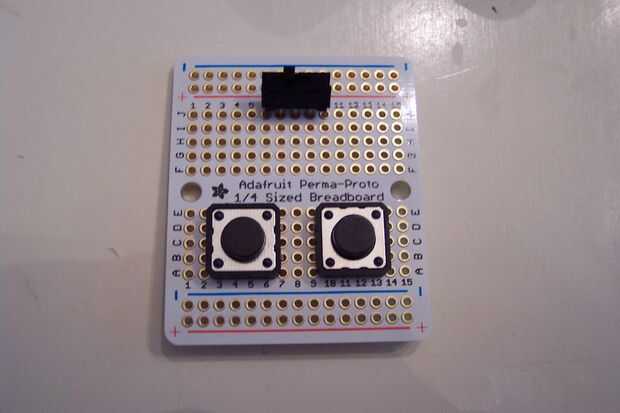 Colocar los botones y cambiar en el protoboard y presione en la tapa para que los componentes se llevan a cabo en su lugar mientras se suelda.