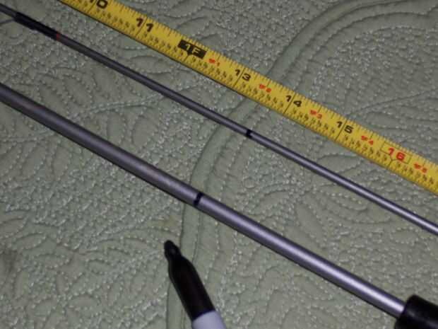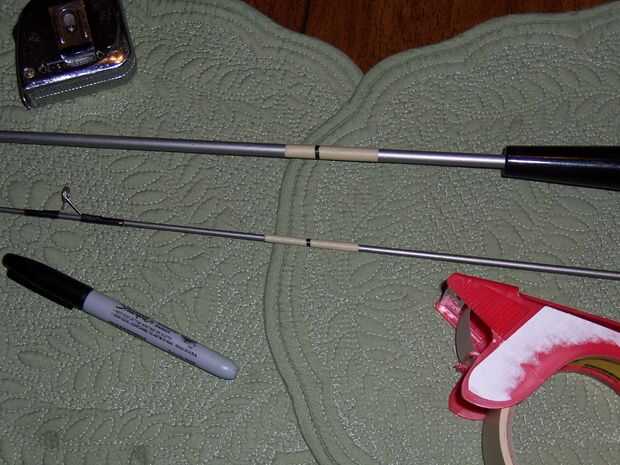 Ok, ahora vamos a donde queremos cortar nuestra barra marca.  Una vez que tienes envolver tu vara con varias capas de cinta adhesiva, esto evitará que la barra de astillar cuando usted corta.  A continuación, vuelva a marcar para los cortes.  Usando una sierra para metales y sujeta firmemente la varilla hacer sus recortes, desenvolver los extremos y ahora tiene cuatro piezas.
