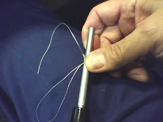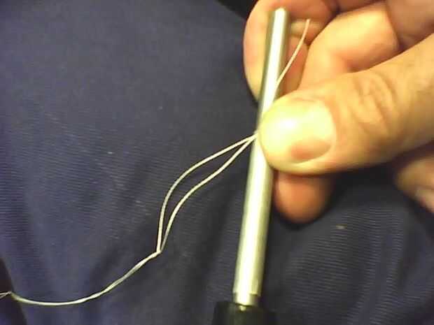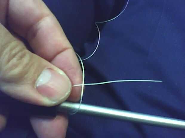 Para colocar su nueva guía de línea y el soporte para la varilla del gancho tiene al viento con hilo de nylon. No estoy seguro por qué algodón no va a funcionar pero hay varios videos en línea y todos dicen utilizar sólo nylon. Necesita una envoltura de base un poco más de la línea guía o estancia de gancho y luego de eso haremos para colocar a la guía de otro abrigo. Antes de empezar, asegúrese de cortar un trozo de hilo de 4 o 5 pulgadas largo para ser utilizado como un bucle de tracción más adelante. Luego iniciar su liquidación, perdón por la calidad de estas fotos que fueron tomadas con un teléfono celular. Hacer un lazo alrededor de la varilla con el extremo suelto de su hilo apuntando en la dirección de le envoltura y tirar ajustado entonces apostar su barra cuatro veces más para un total de cinco lazos y cortar el el extremo suelto. Continúe la bobina, manteniendo el hilo de rosca ajustado y apretado un poco, sostuve el carrete con mis rodillas mientras que la bobina y manteniendo el hilo de rosca ajustado balanceo la barra con ambas manos. Cuando llegues casi al final de su envoltura toma que pedazo de 5 pulgadas de hilo cortado al principio, hacer un lazo y deslice en el hilo que está bobinado en la barra. Rollo de cinco a ocho lazos con su lazo tirando en la bobina luego corte el hilo de envolver, inserte el extremo suelto a través del lazo y tire del lazo a través de así su extremo suelto sale cinco vueltas hacia arriba la varilla. Cuidadosamente corte el hilo con un cuchillo afilado como cerca posible de la envoltura pero no corte la envoltura o harás todo esto otra vez. Tenía un abrigo que requirió un segundo intento.