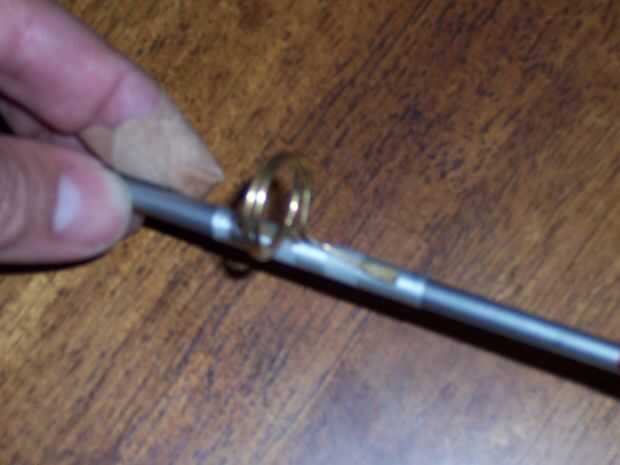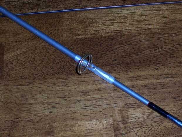 Ahora estás listo para colocar tu nueva línea guía (ojal) y enganche la estancia. Usar cinta scotch regular pero sólo una pequeña franja. Tirar un trozo de una pulgada o dos largo entonces rasgan longitud sabio por lo que terminas con un trozo de cinta mitad o menos el ancho del pie guía. Ahora ambos lados de la guía de la base abrigo que acaba de terminar en la barra de la cinta. Luego hacer una envoltura superior al igual que antes, con el abrigo de base, a partir de más allá el extremo del pie y envuelva en hacia el centro. Deberá usar el pulgar para sostener el primer lazo que obtiene en el pie que le resbale. Por cuando que llegues al segundo o tercer bucle debe permanecer en lugar propio. Al llegar cerca del final de su envoltura superior, deslice el lazo tirando bajo el abrigo de enfrente de la guía.  Esto le ayudará a mantener la tensión en el abrigo superior.  De lo contrario puede venir revelado.