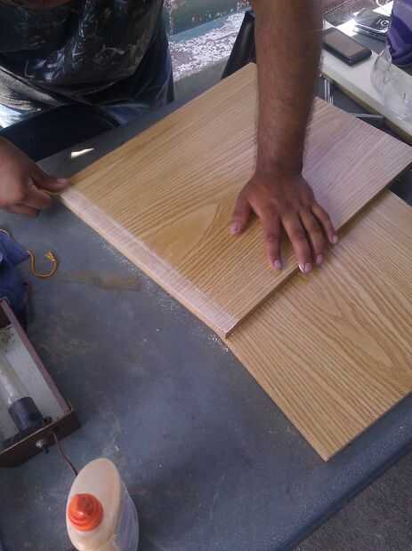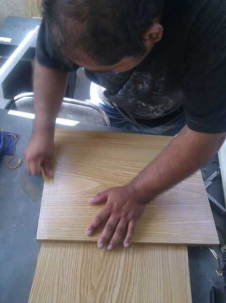 Después del corte, tenemos que asegúrese de limpiar las áreas que fueron cortadas y preparación de las juntas de construcción más. Usando una lijadora de Palma y papel de lija de grano 80, lija en los bordes de los tableros que se iban a hacer contacto. Esto garantiza que la madera pegamento usado se adhieren y proporcionar un vínculo más fuerte. Después de limpiar la arena con alcohol desnaturalizado y aplicar una cantidad generosa de madera del pegamento, que presiona los tableros juntos y clavó en su lugar con una pistola de clavos neumática conectada a un compresor de aire 3 galones (usando 1 1/2 pulgada clavos dispararon a 80 psi). Este paso se repite hasta que todas las partes fueron Unidas para completar un marco de cuadro básico.