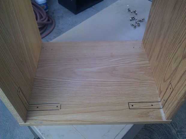 Antes de alejarse de la caja hemos perforado los agujeros donde la fuente de alimentación y amplificador superior iban a ser cuidadosamente miden un punto de intersección para las tuercas del pasador Cruz y hecho los agujeros correspondientes. La gran cosa sobre el uso de estas tuercas pasador Cruz es que no perdemos la integridad de nuestro material. Esto es un sistema mucho mejor que simplemente perforar algunos tornillos de madera, destrucción de riesgo de un mal cálculo y tiene el peso desnudo completamente donde los tornillos ancla (uso tornillos pequeños riesgo falta de fuerza, uso largo tornillos riesgo masticar para arriba de las tablas). Después de comprobar que los orificios para los tornillos y Cruz pasador tuercas alineadas nos aerosol pintado el interior completamente negro y se trasladó a trabajar en los accesorios.