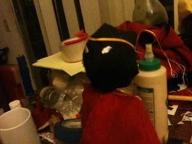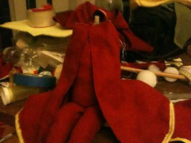 Cubra el manto sobre los hombros de la marioneta y deslice el hilo de pescar para la cabeza a través del espacio. Encontrar donde el cabo se cae el ancla de la línea de pesca en la zona lumbar. Utilice una aguja de coser para tirar la línea a través de la capa en ese punto.