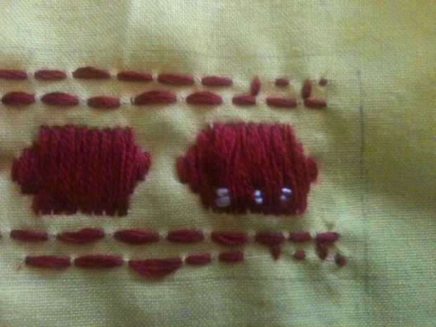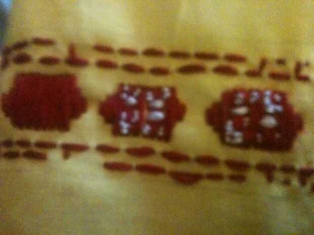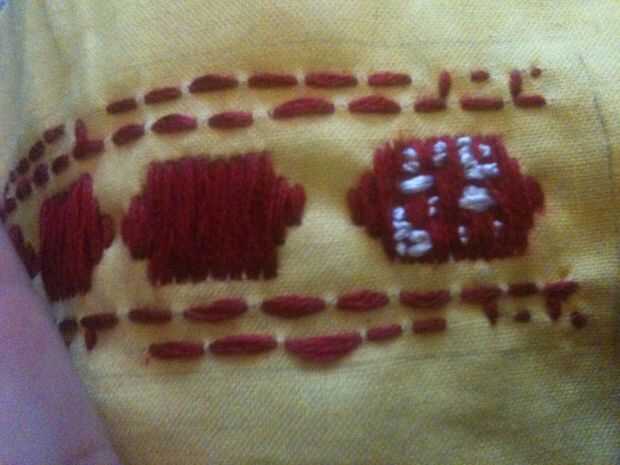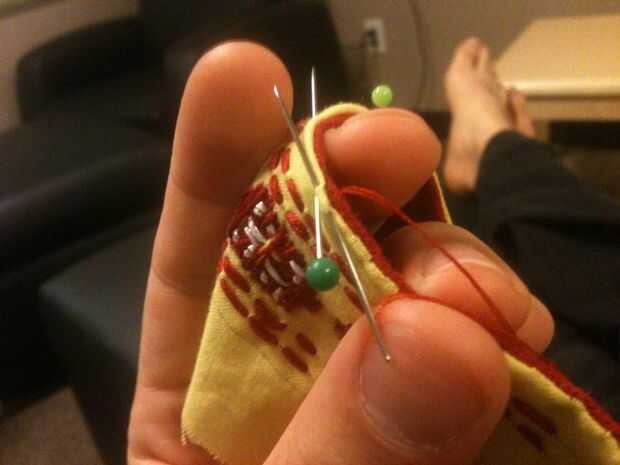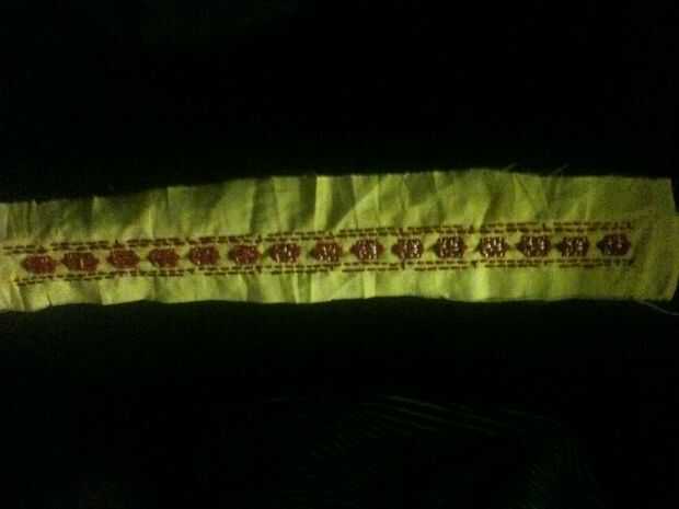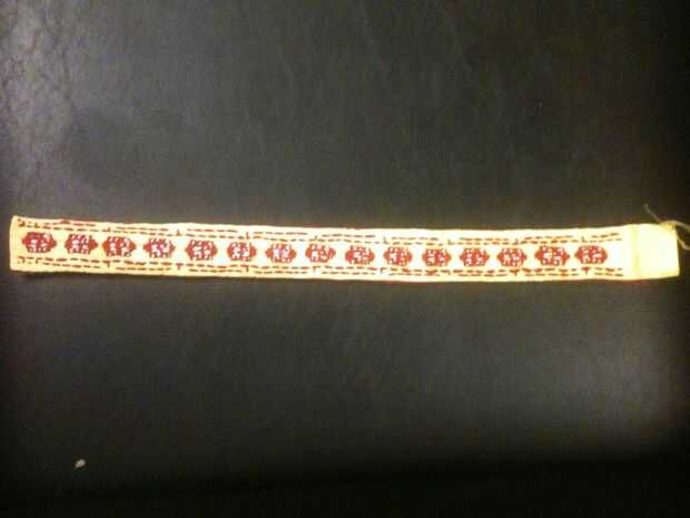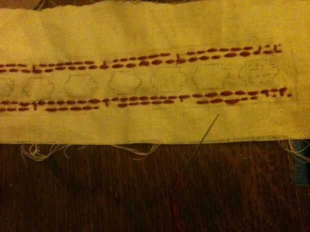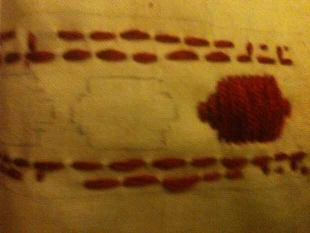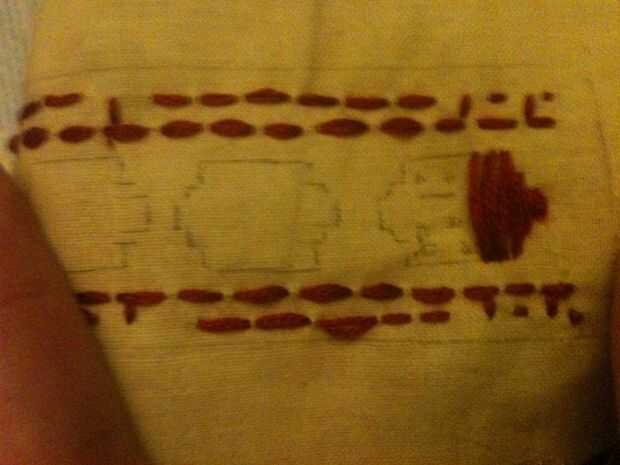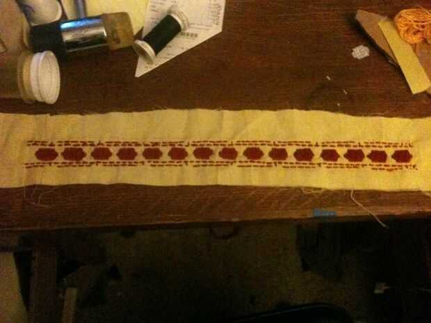 Si usted quiere tratar de bordar la bufanda, que es un proceso largo y repetitivo. Si no quieres aguantar con todo esto de la costura puede tener un tiempo más fácil pintar el patrón o la versión no encantado de la bufanda de bordado. Para iniciar la rosca una aguja de bordado con un par de hebras de floss rojo. Comienza por las líneas rojas a los lados de la costura, luego pasar a las formas rojo en el medio. Llene estas formas completamente por costura a través del mismo ancho. Una vez que rellene todas las piezas rojas, su aguja con hilo blanco bordado del hilo de rosca y añadir a los glifos mágicos, costuras verticalmente encima de la rosca roja horizontal.