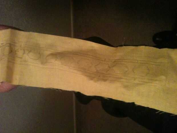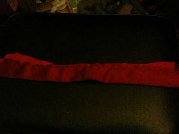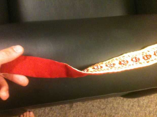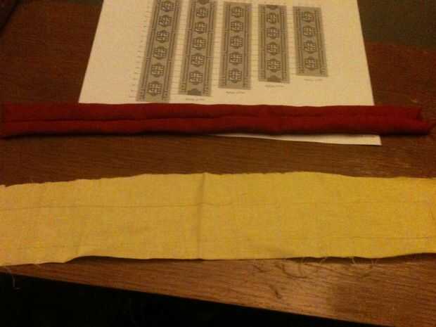 Dibujar un rectángulo de 1 1/4" de ancho en tela amarilla, la misma longitud que la bufanda roja. Recorte con un margen alrededor del contorno. Tomar este tiempo para decorar la parte amarilla de la bufanda. Imprima unas cuantas imágenes de referencia y copiar el diseño en el rectángulo amarillo en luz lápiz o algo lavable.
