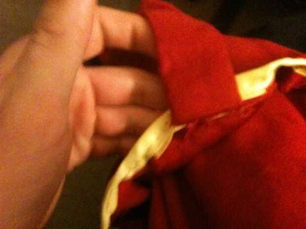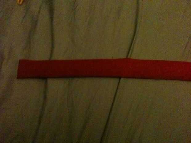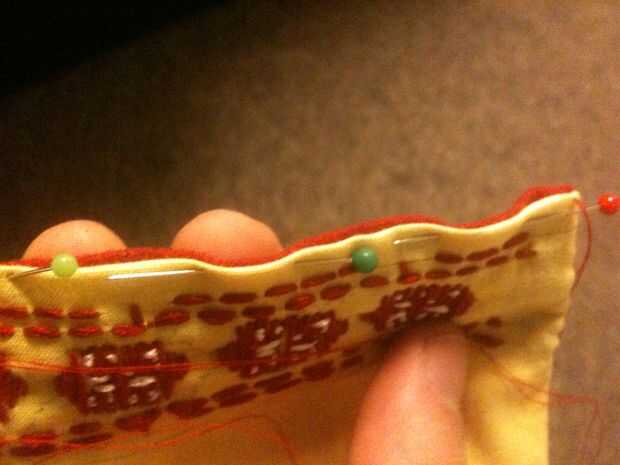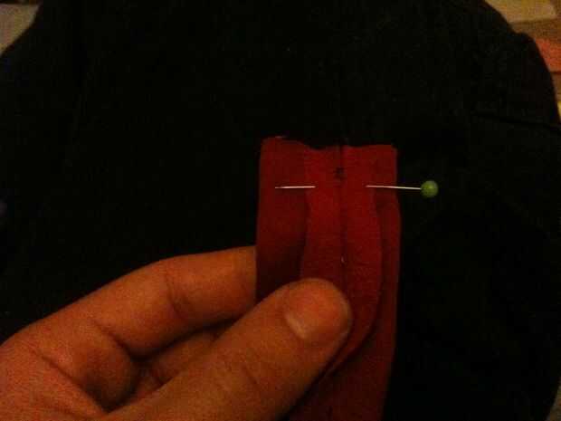Cuando el patrón haya terminado, doble los bordes de la tela amarilla y pin hasta la bufanda roja, que abarca hasta la costura grande por la mitad. Unir los lados con una puntada de resbalón con hilo rojo o amarillo. Ahora debería tener una bufanda de dos colores acabada. Tome el extremo de la bufanda y coser al cabo de su marioneta, bajo el capó. Encontrar el lugar donde el pañuelo cae sobre la línea de pesca anclada a la espalda del muñeco. Así como antes de, cadena de la línea de pesca a través de una aguja de coser y dibujar a través de la bufanda así no interfiere.
