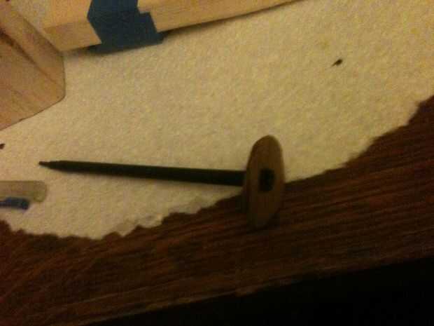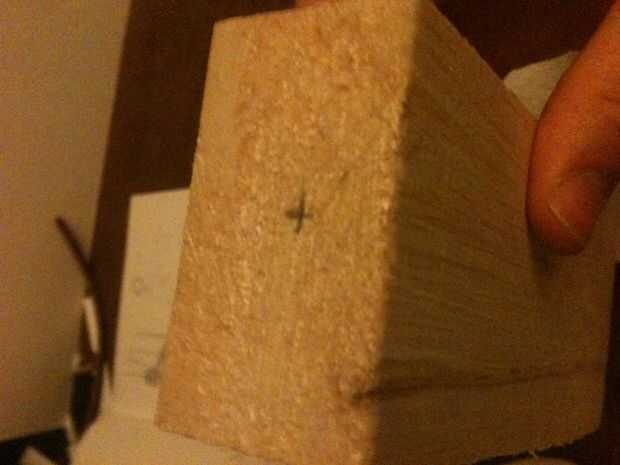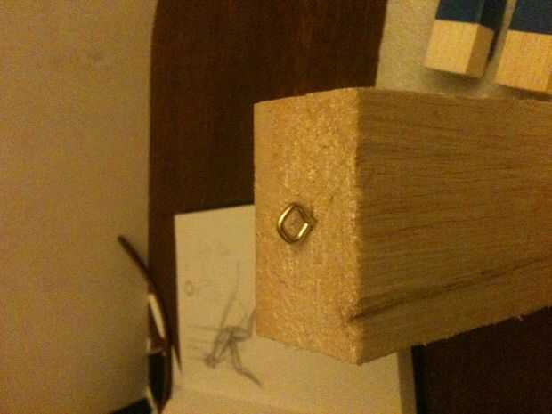 En la parte superior del bloque de cuerpo (el lado es 2 1/2" de ancho) Coloque una marca en su centro e instale un tornillo de ojal aquí. Este será donde se instale la cabeza. Tome una longitud de hilo de pescar y un extremo a este ojete del ancla. Esta será la cadena que llega hasta la Cruz de la barra se utiliza para el control de la marioneta.