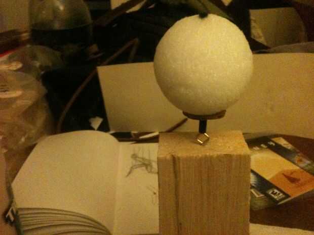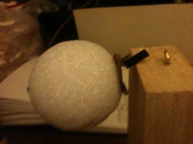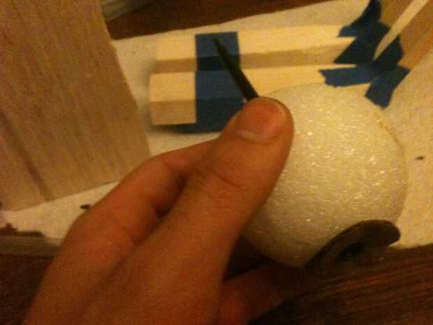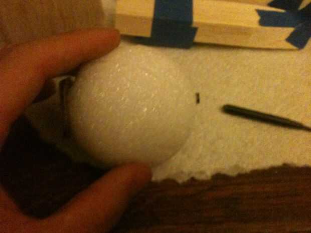 Para la cabeza, necesita un eje hueco por su bola de espuma de poliestireno. Esto es donde el sedal se ejecutará a través de la cabeza, por lo que necesitarás para este eje con un tubo pequeño para mantener la línea de corte a través de la espuma de poliestireno. Para ello tomé aparte un portaminas ya rotos y sacó un pequeño tubo hueco de dentro. Introduzca el tubo en un lado de la bola, a través del centro y por el otro. Afeitarse el exceso y reservar.