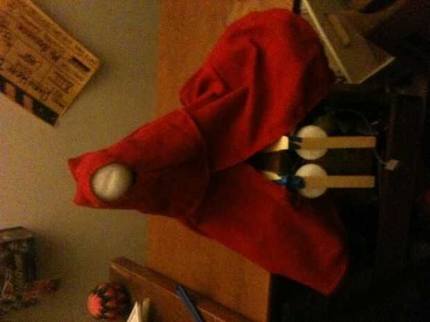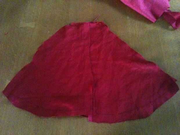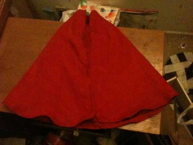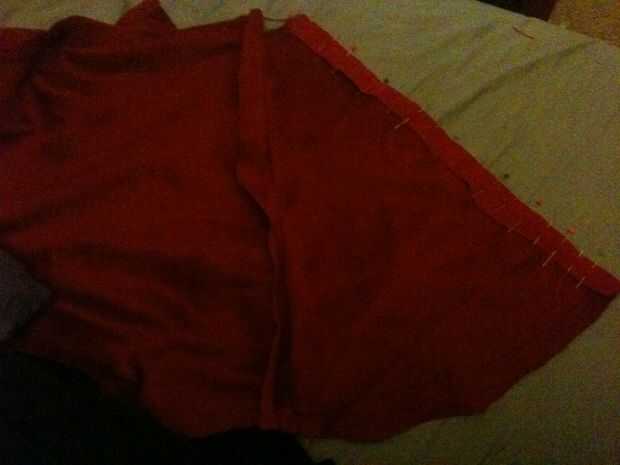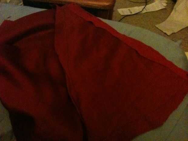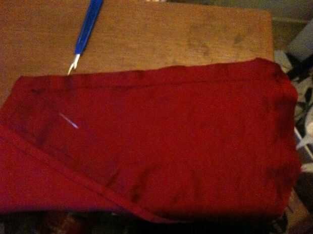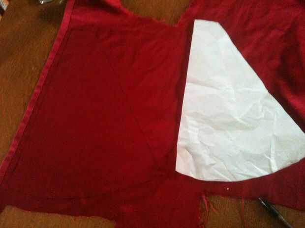 Para encontrar el tamaño y la forma del tercer panel, junte los dos primeros para que los bordes rectos verticales se encuentran en el medio. Arreglar los tres paneles con sus lados buenos, los dos primeros espejado entre sí en la parte superior del panel tercera, más grande. Coser por los bordes izquierdos y derecho con hilo rojo. Siguiente doblez en los bordes rectos sin terminar a la mitad, a lo largo de la línea. Perno en su lugar y coser encima con hilo rojo. Otra vez puedes coser desde el exterior por esta parte, ya que la costura mostrará cuando usted haya terminado.