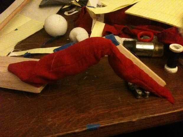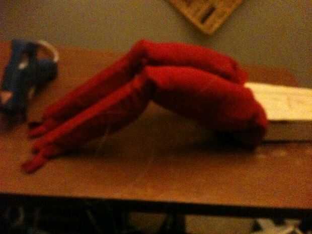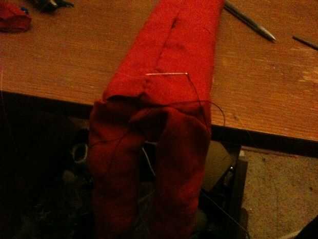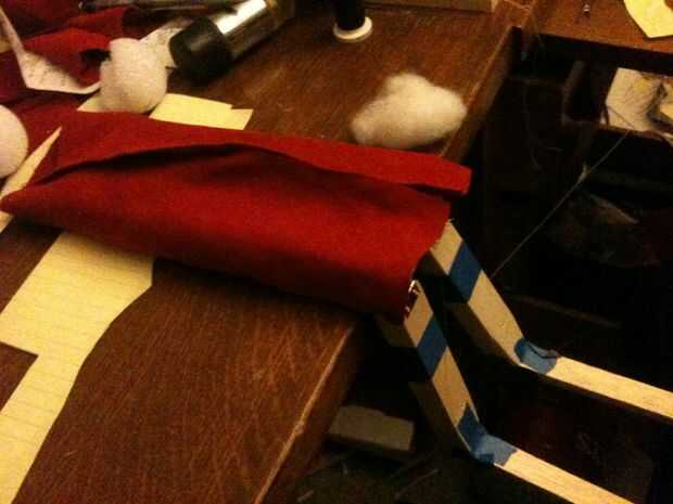 Encontrar el lugar en la funda de la pierna donde está anclado su línea de pesca para cada muslo. Enrosque el extremo libre de la línea de pesca a través de una aguja y tire de ella a través de la tela en ese momento, por lo que el cable llega directamente a través de la tela a la pierna. Cuando deslice la tela de la cubierta sobre la madera, utilice los extremos abiertos en la parte superior e inferior para alimentar en algún relleno y llenar los bolsillos sueltos. Pulse en algún relleno en el frente y parte posterior de la pierna superior, pero sólo la parte posterior de la pierna hacer un becerro. Remeter los bordes sueltos en la parte inferior y coser con hilo de rosca rojo cerró.