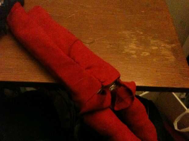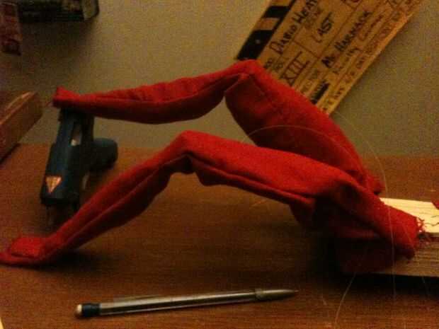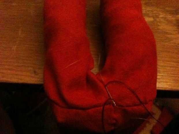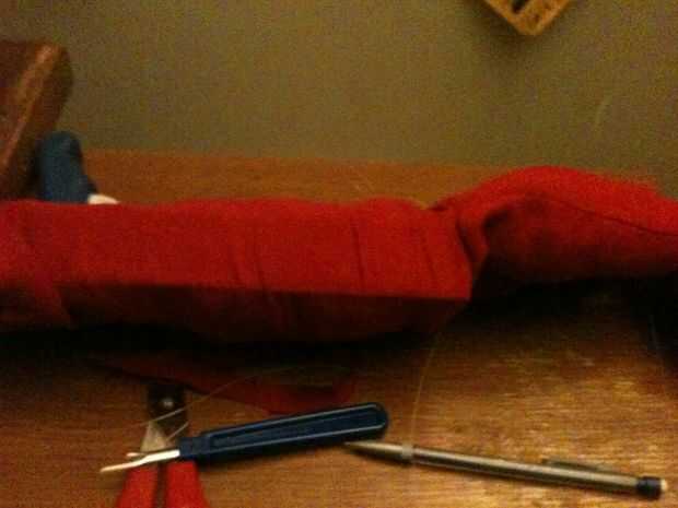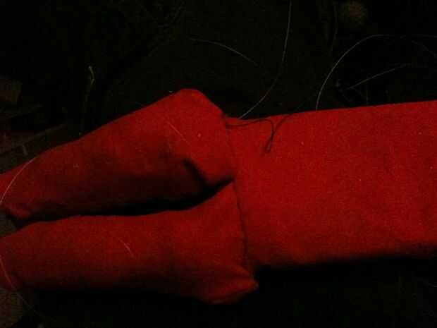 Añadir un poco relleno a la parte delantera del cuerpo a hincharse su vientre plano. Tratar de mantener el relleno de la parte inferior del bloque de cuerpo, o bloqueará la pierna de subir todo el camino. Coser los bordes de las cubiertas de la pierna hasta el borde de la cubierta del cuerpo con una puntada de resbalón con hilo rojo. Si terminas con la tela sobrante intentar trabajar en la parte trasera donde no se verán las arrugas. Coser los bordes interiores de las patas entre sí y cerrar la parte inferior.