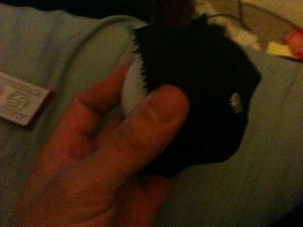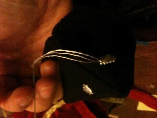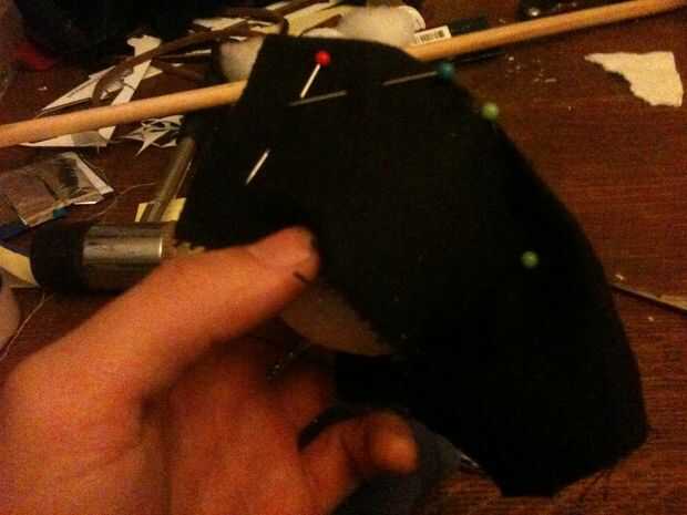 Cuando tengas todo junto, encontrar las piezas de la tapa negra que caen sobre los orificios en la parte superior e inferior de la cabeza. Utilice una aguja de coser para tirar el sedal a través de la tela así que viaja un camino casi recto en la tela en la parte inferior, a través del eje hueco en la cabeza y de la tela en la parte superior.