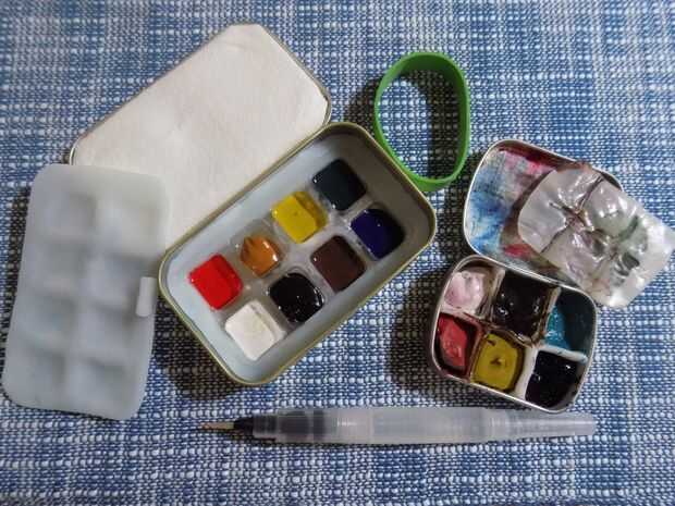 una pequeña pintura acuarela set que tiene 5 cacerolas la mitad de agua de color y cabe en su bolsillo junto con las llaves.Es perfecto lanzar en un bolso del monedero o del pañal del hombre, lo que usted prefiere. Personalmente, guardo esto en el co