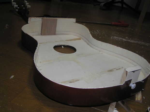 Usé un cincel y pudo simplemente quite las llaves. Usted quiere la parte posterior de la tapa armónica para ser plana así que usted puede pegar en una tabla en el paso siguiente.