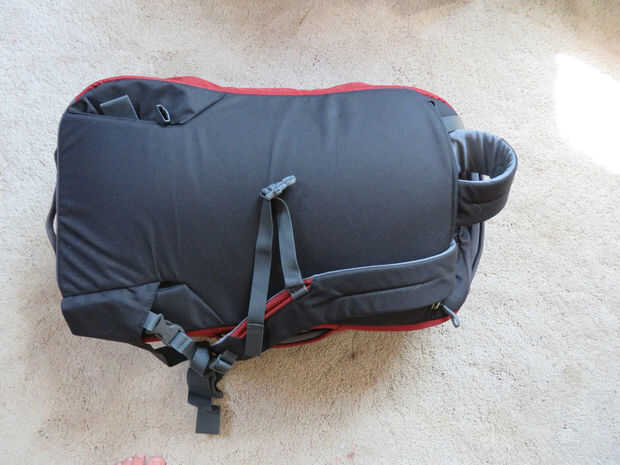 2. mi original único equipaje es la mochila Ferrino roja y negra. Cumple los requisitos de tamaño máximo del equipaje de mano, siempre y cuando no es demasiado pesado. Está diseñado para mochileros, por lo que las correas de hombro y cadera son muy cómodas. El estilo de carga superior hace busceda de un objeto enterrado un dolor aunque, y la parte superior del lazo no es bloqueable. El número de correas colgando suelto dificultaría registrar como equipaje.