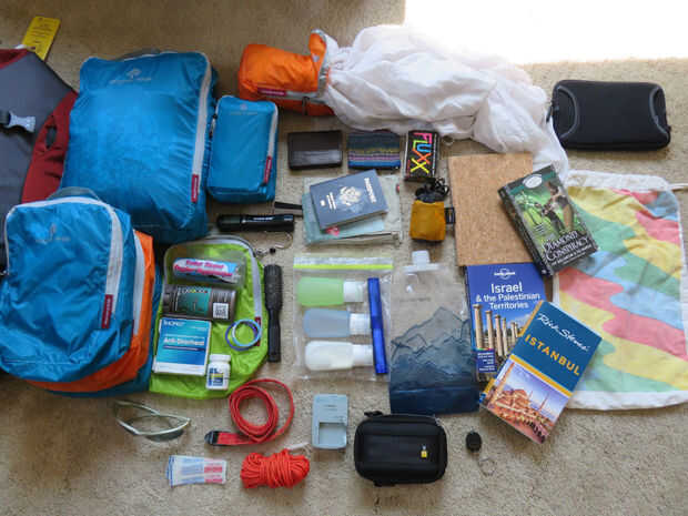 No mostrado: convertidores, fotocopias de tarjetas de crédito y el pasaporte, imprimen copias de reserva de hotel y avión (no confíe en electrónica como su única copia para esto!), varios cientos de dólares en efectivo (no todo en un solo lugar) y una bolsa de lona que se pliega pequeño, para que puedas comprobar algunas de sus cosas en el camino a casa si compras demasiados recuerdos!