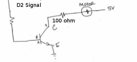 Este esquema muestra cómo hemos conectado el motor. Para obtener suficiente corriente para el motor de accionamiento utiliza un BJT NPN Transistor 2N3904. Usted puede encontrar su datasheet aquí.
