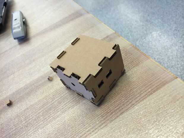 - Cortamos nuestro diseño sobre cartón para probar primero. Una vez que hemos verificado las dimensiones, cortamos el dispositivo de acrílico. Los archivos vibeaware.pdf y vibeaware.cdr mostrar el diseño final para el cortador del laser.