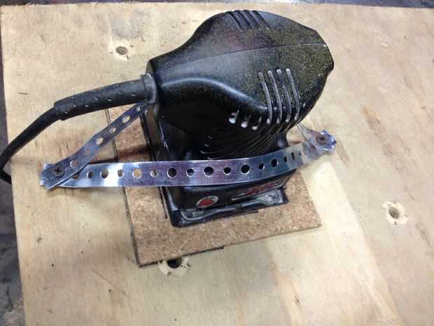 En las fotos es fácil ver la construcción. Correa de la lijadora a la Junta. Lo más importante a tener en cuenta es no atar con correa lo abajo demasiado apretado. Si usted fija la base de la lijadora a la Junta, es la lijadora que se moverá. Aviso los 3 tornillos en cada lado de la banda en el cuadro final, ajusta la presión que la lijadora está aplicando a la madera.
