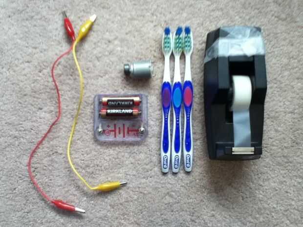 Necesita: 3toothbrushes 1small batería fuente 2alligator cables motor ponderado vibrante 1 cinta