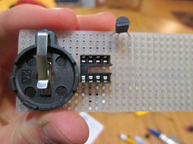 Agregar el transistor a la Junta, cerca del borde superior y como cierre a la toma de chip como sea posible, sin entrar en contacto con cualquiera de las líneas de conexión de pines/placa perforada del zócalo. Doblar la resistencia de 220 ohmios y las patas del diodo como se muestra en la fotografía, para ahorrar espacio y colocarlos como se muestra en la imagen, de las tiras del transistor. Asegúrese de que el lado plano de transistores se enfrenta a la resistencia y el diodo. El, tome la resistencia de 3300 ohmios y conectarse a un lado la tira hacia el pin medio de transistores y el otro conecta a la esquina del zócalo del chip. Observe que está conectado a la toma, porque esto es importante y si se realiza la conexión de pin incorrecto, entonces el motor no funcionará.